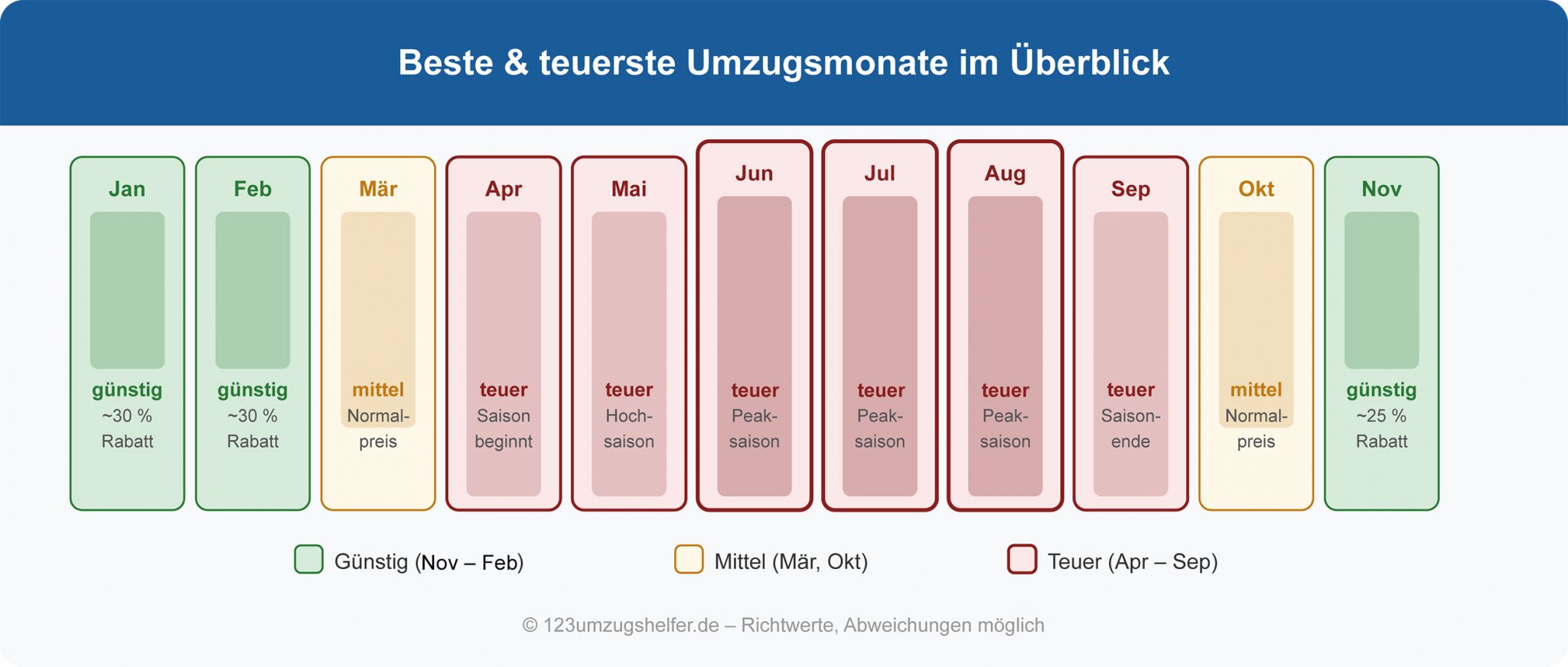 Der Zeitpunkt des Umzugs hat einen enormen Einfluss auf den Preis. Umzugsunternehmen berechnen in der Hochsaison und an beliebten Terminen deutlich mehr:Teuerste Zeiten: