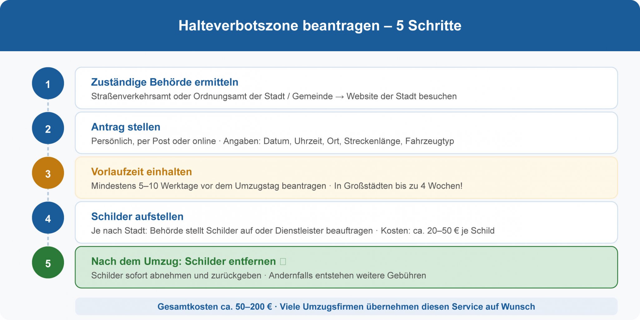 Tipp: Viele Umzugsunternehmen übernehmen die Beantragung und das Aufstellen der Schilder als Zusatzservice. Fragen Sie im Angebot danach – und vergleichen Sie, ob es günstiger ist, es selbst zu erledigen.