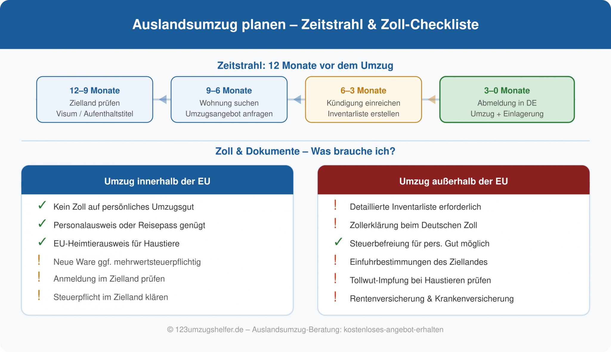 Empfehlung: Starten Sie die Planung mindestens 6–12 Monate vor dem Umzugstermin. Bei außereuropäischen Umzügen noch früher.