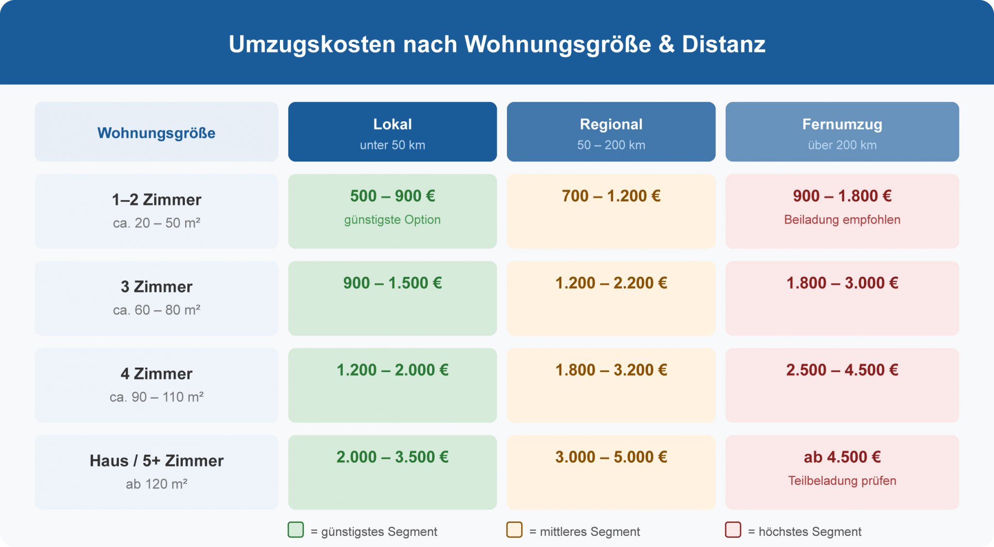 Je nach Region und Stadt können die Preise stark variieren. In Großstädten wie München, Hamburg oder Frankfurt liegen die Preise häufig 15–25 % über dem bundesweiten Durchschnitt, da Personalkosten, Parkgebühren und allgemeine Lebenshaltungskosten höher sind. In ländlichen Regionen und Ostdeutschland sind Umzüge oft günstiger.